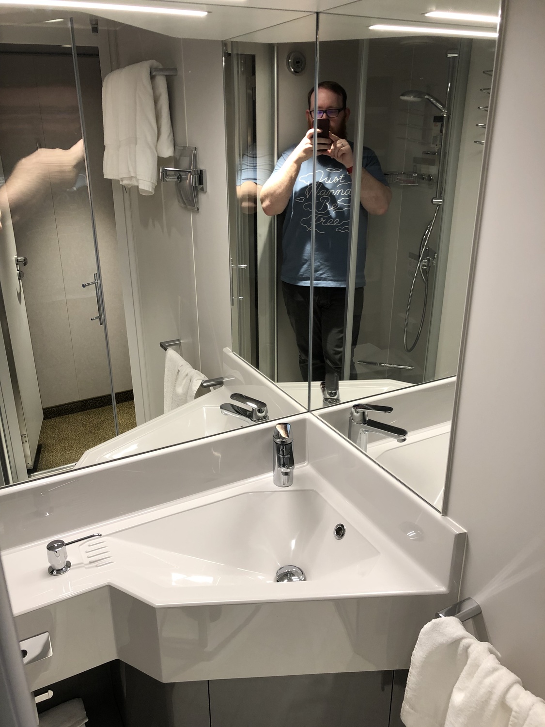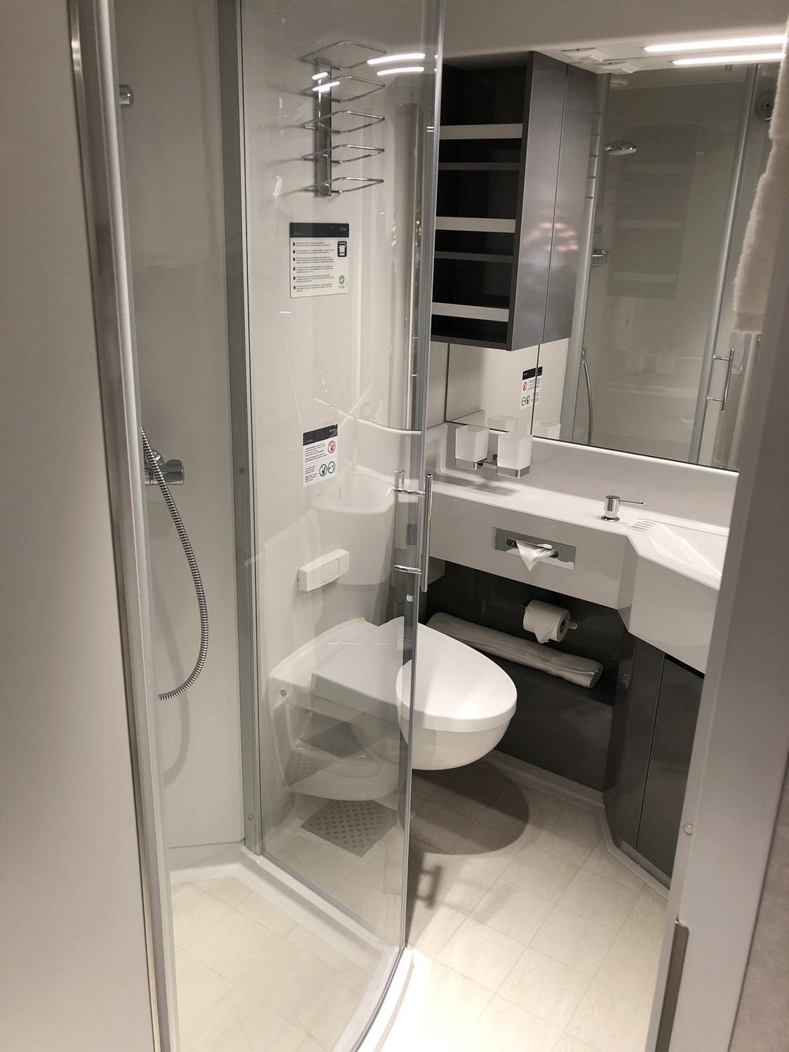 The bathroom on the ship is one of the best designed I’ve seen on any ship. What’s interesting is that the the stateroom door is set back from the corridor, and the bathroom expands into the corridor. You’d be forgiven for thinking there was no bathroom at all while you were inside the stateroom!