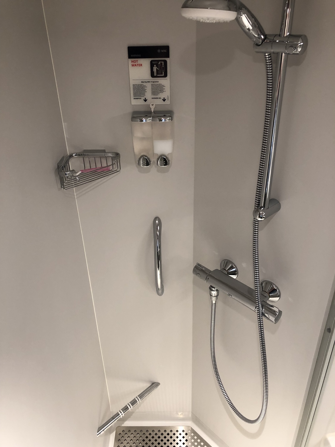 The shower also boasts a little bar to rest your foot on while washing or shaving your legs, which is a thoughtful feature I first saw on Celebrity’s Solstice Class ships.