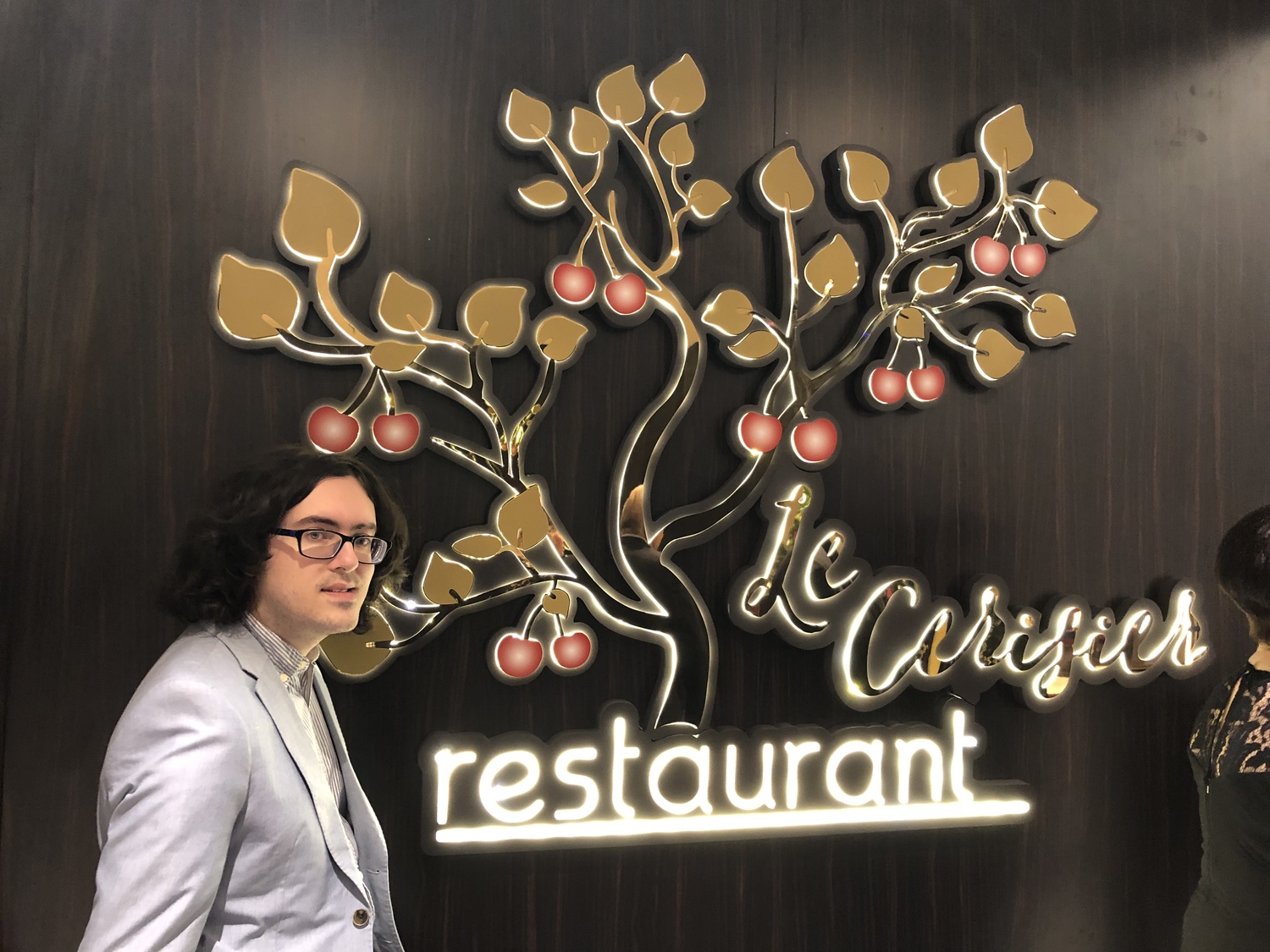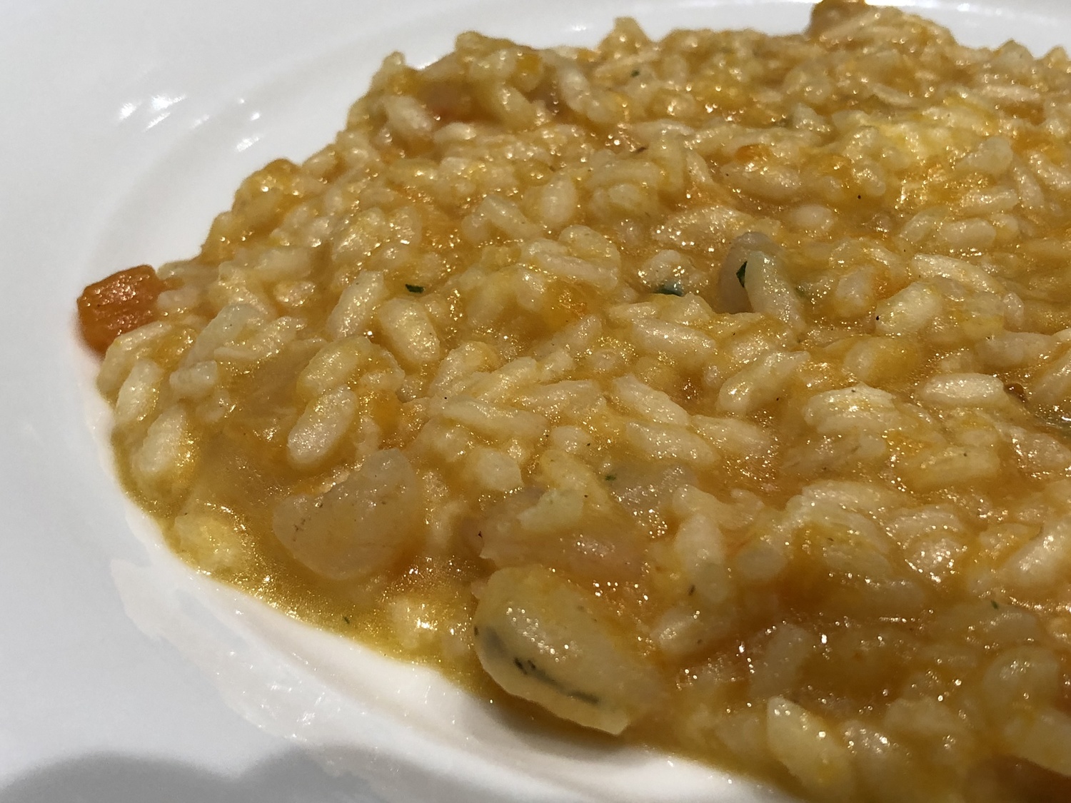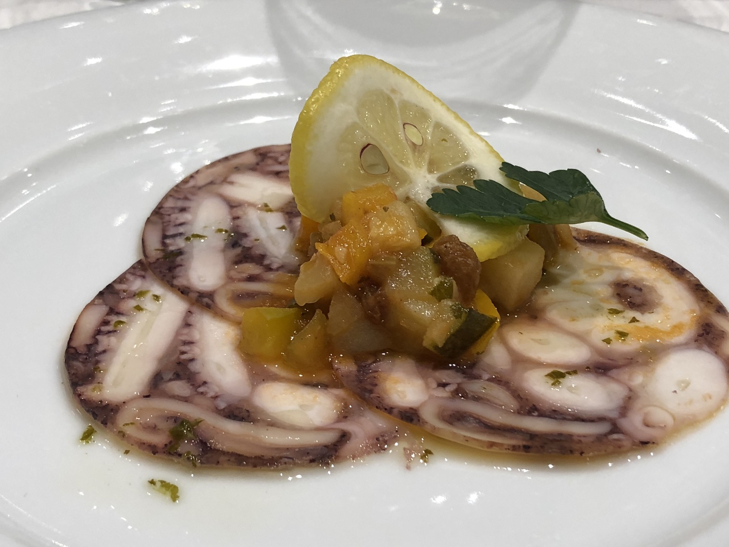 To start, I pigged out a bit tonight and had two starters - lobster bisque and escargot in puff pastry. Both sounded delicious, but were both beaten by Alex’s delicious octopus carpaccio. For my main course I went for the recommended choice of lamb leg with potatoes and tomato au gratin. This was disappointingly overcooked and I think it’s silly to do roast potatoes when other potato dishes are easier to keep warm and serve to a lot of people. Alex won this round again with his excellent choice of pumpkin shrimp risotto which was delicious and nicely cooked. I opted for the cheese which was a little odd and lacked a reasonable selection of breads or crackers. Alex’s ‘lemon delight’ (sponge cake with limoncello cream) was the better choice again.