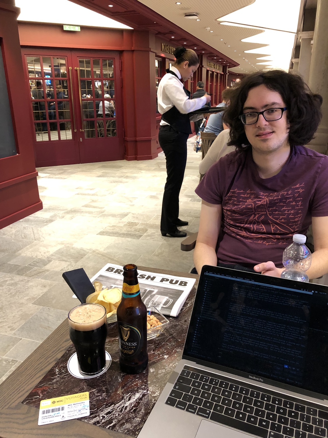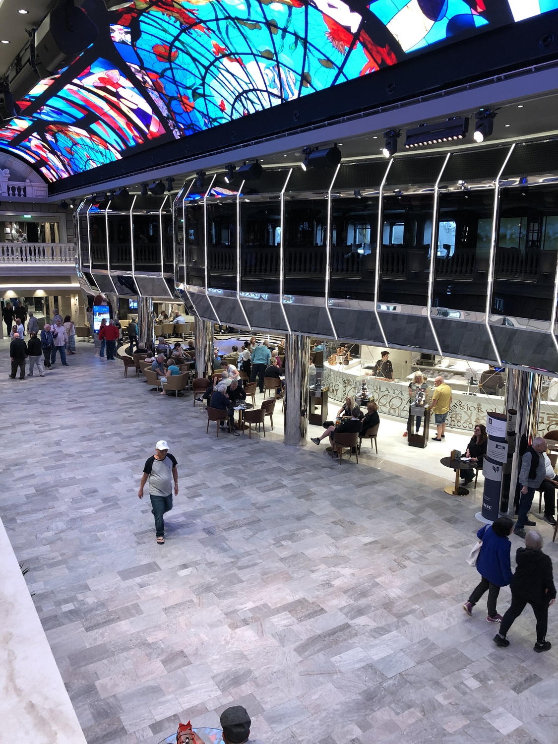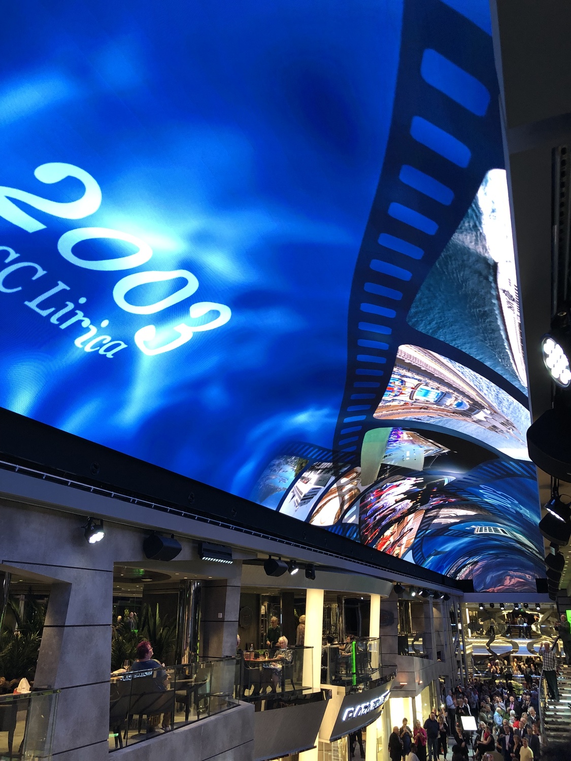 We spent the rest of the afternoon relaxing. Alex thankfully started feeling a little better, so we got changed for formal night and headed out. We found a spot at the pub where we had a couple of drinks and watched the ‘Dome Show’ which is an audiovisual presentation on the screen ceiling of Galleria Bellissima. This turned out to be little more than a history of MSC included images of their ships with uplifting music. It felt more like an advert, and not a great use of the technology. There’s another show called Cities and Museums which we’ll have to try later in the cruise.
