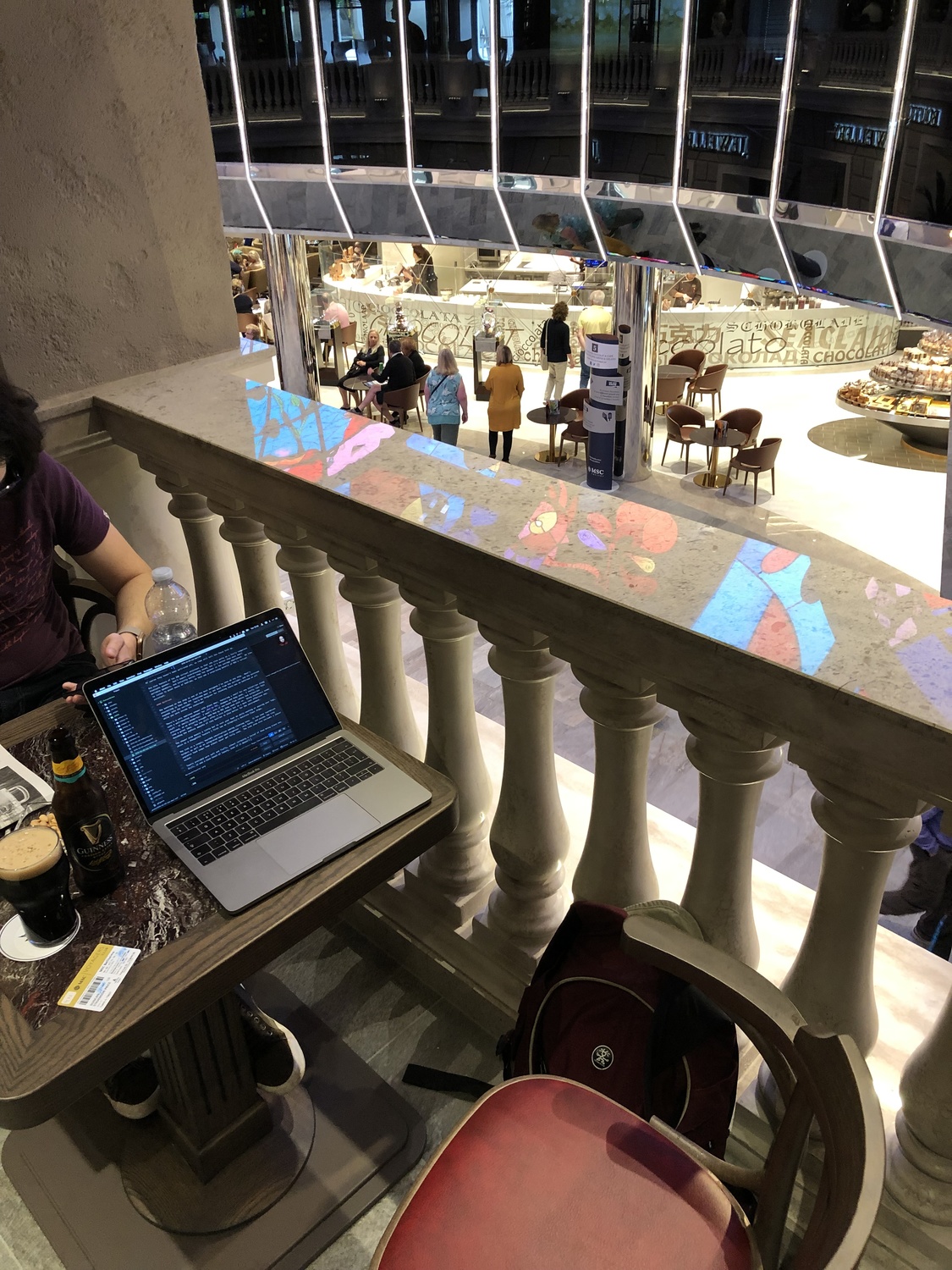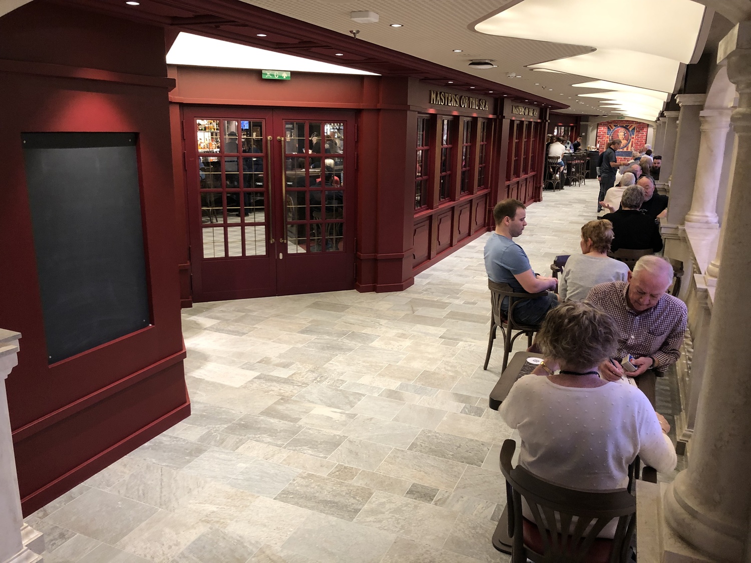 Seeing as we’re having a lazy day, I’ve found a table outside the British pub called “Masters of the Sea”, overlooking the bustling Galleria Bellissima. It’s a great place to blog, with bar service and awesome people-watching. Alex is enjoying his book while I blog, and I think the movement is less pronounced here.