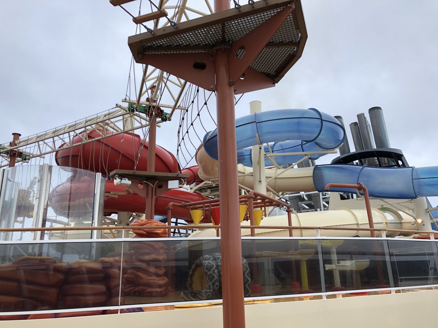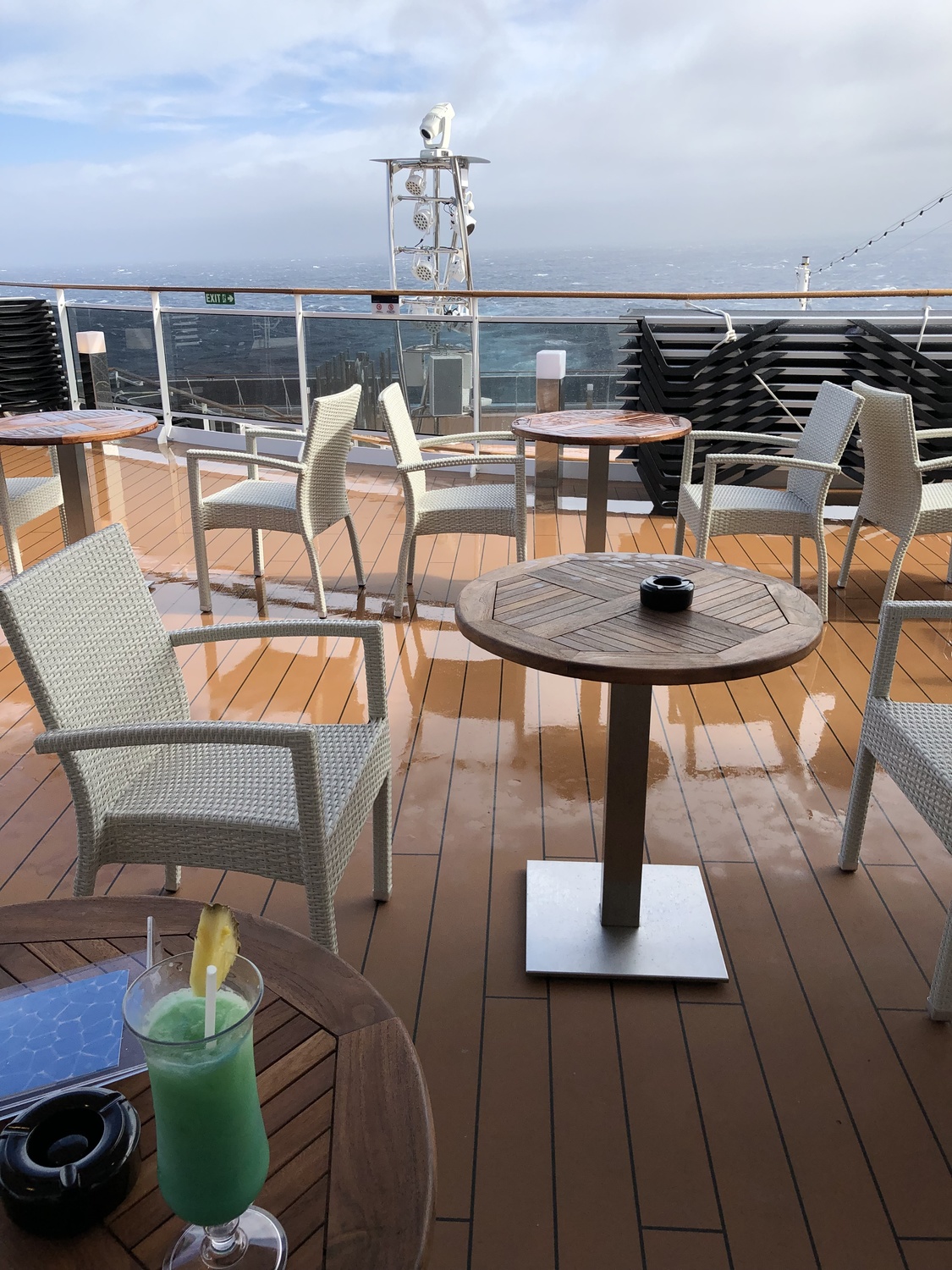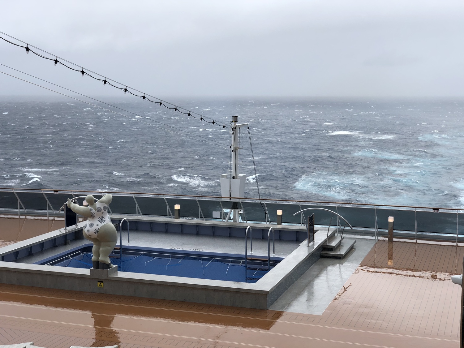 All of the deck chairs were tied up, and the pools drained and covered with nets. Not that you’d want to take a dip in this weather anyway, though sitting in one of the hot tubs overlooking the sea might be fun!