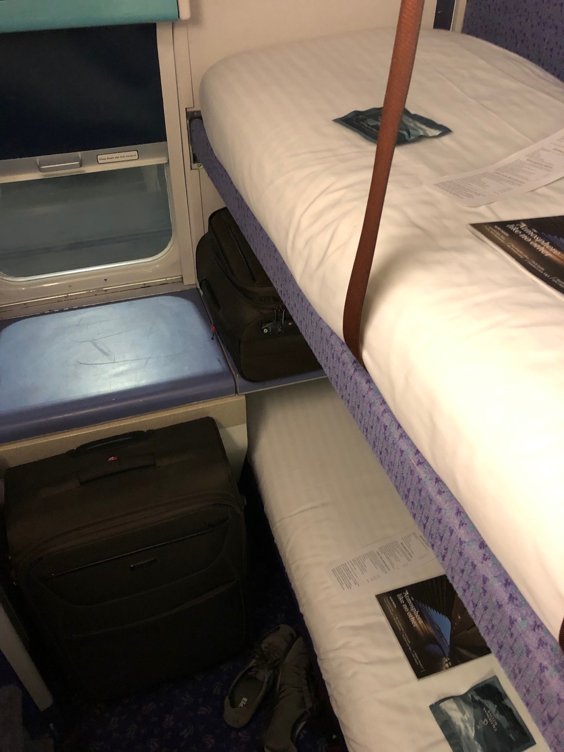 I wasn’t quite prepared for how small the sleeper berth would be. The space between the wall and the bunk was about the width of our suitcase. The bunk itself was narrower than a standard single bed. Our suitcases filled a lot of the available floor space, but the was an overall good use of space meaning the berth was quite functional.